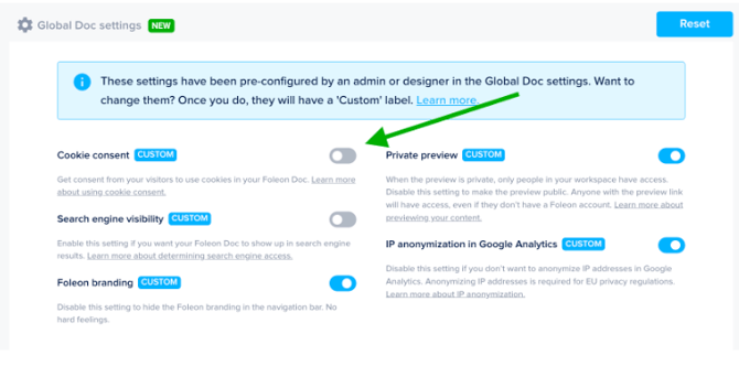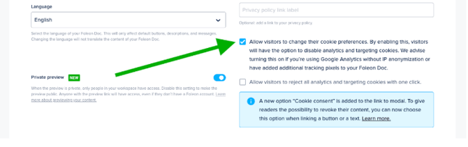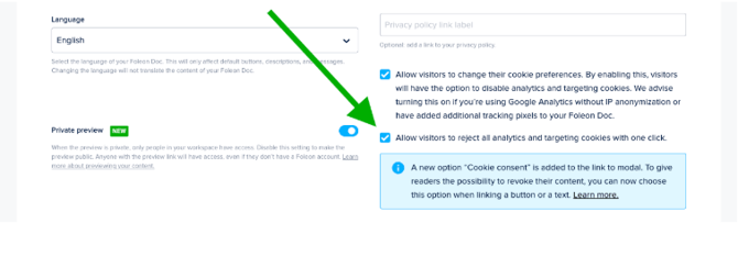 First, make sure that you’ve enabled the checkbox in your Doc settings that allows your audience to change their cookie consent preferences.