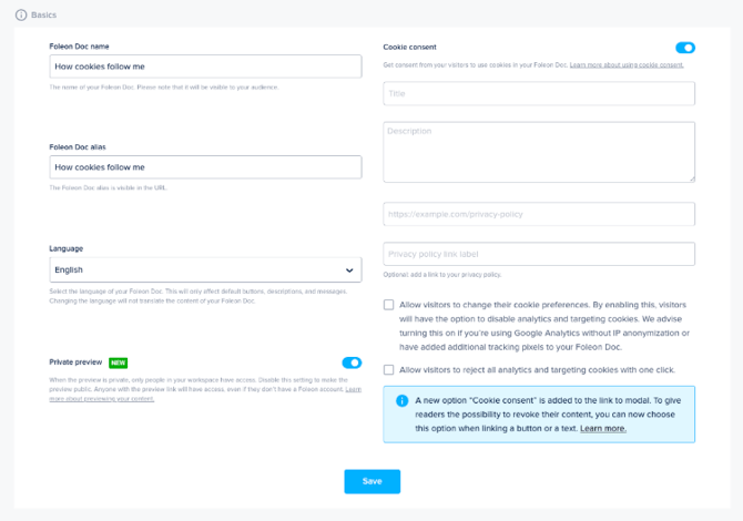Every Foleon Doc has cookies, and according to GDPR regulations, you need to inform your readers about these cookies. In this article, you learn why this is important and how to set up the cookie consent pop-up.