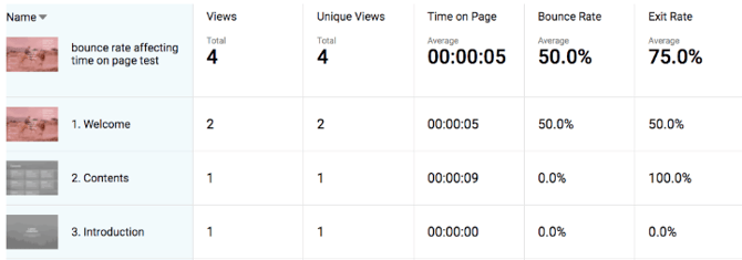 The average time spent on each page differs slightly between Foleon Analytics and Google Analytics. You can see Google Analytics has two page views for the first page of the Foleon Doc. One is ~11 seconds, and the second one is 0 seconds (bounced).