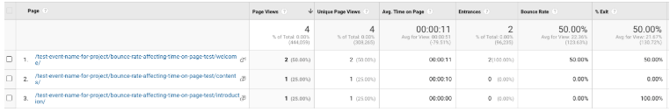 For Google Analytics, the average time on page report will look like this: