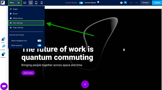 Click Menu > Doc settings in the editor to navigate to your Doc settings.