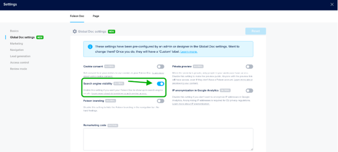 In the Foleon Doc Settings, in the Global Doc Settings tab, you will see the Search engine visibility toggle.