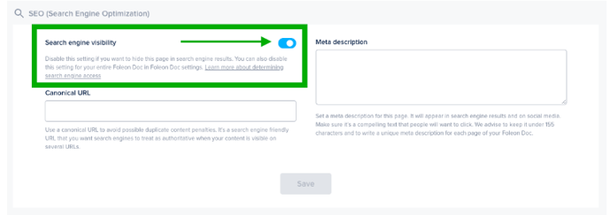 By default, the search engine visibility toggle is switched off. This means we don't allow search engine crawlers to crawl your content — preventing the entire Foleon Doc from appearing on search engine result pages.